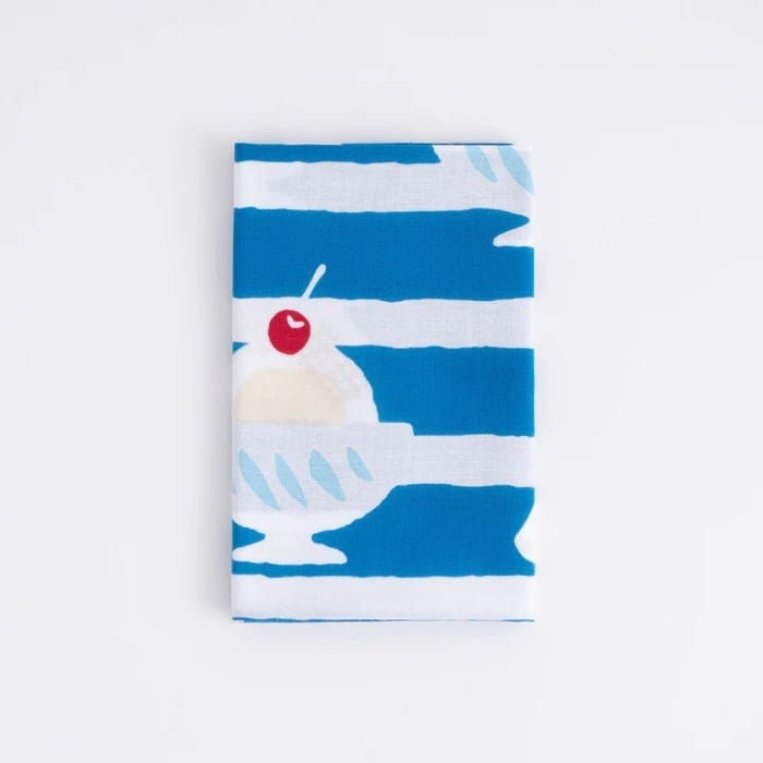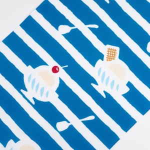 喫茶店のメニューにあるようなどこか懐かしい雰囲気のアイスクリームが、夏らしい爽やかなボーダー柄になりました。暑い夏にひんやりと、楽しい気分を届けてくれる一枚です。