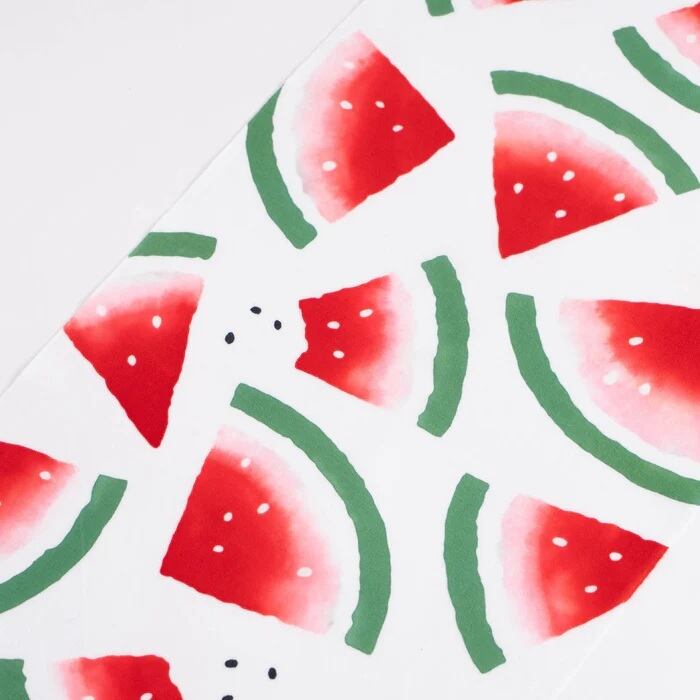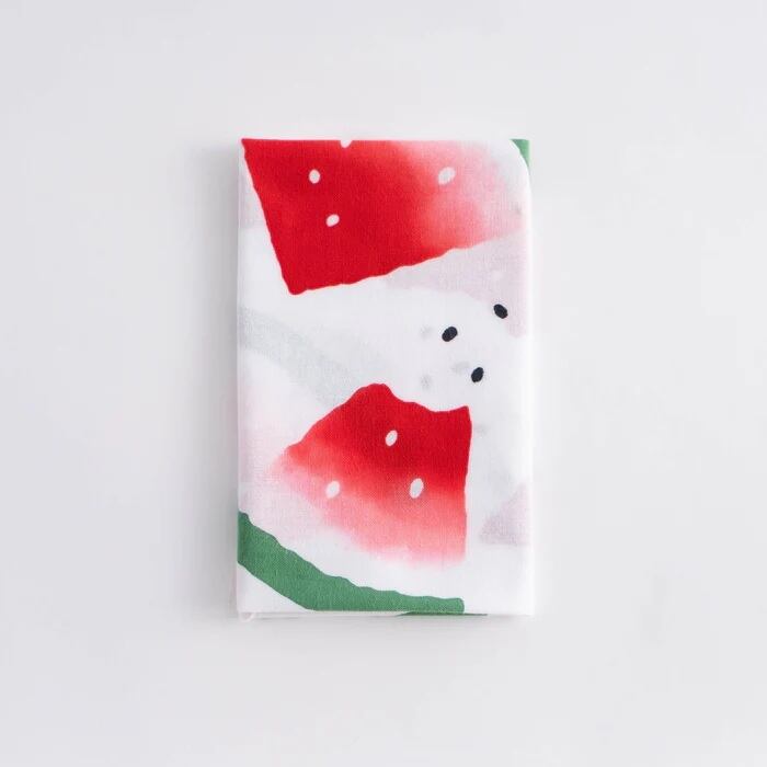 夏を代表する食べ物のすいかを、注染ならではのぼかし染めでみずみずしく描いています。食卓に飾ると涼やかな一枚です。