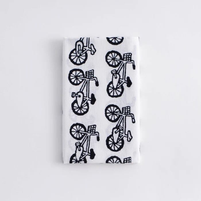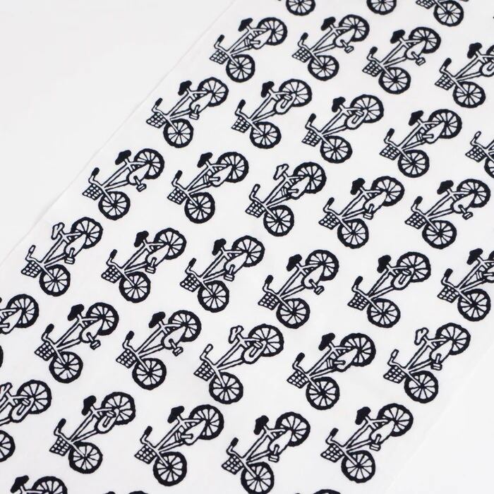 手描きの線で、ゆっくりと前進する自転車を描きました。このてぬぐいを持って、自転車に乗って出かけたくなるような楽しい柄です。