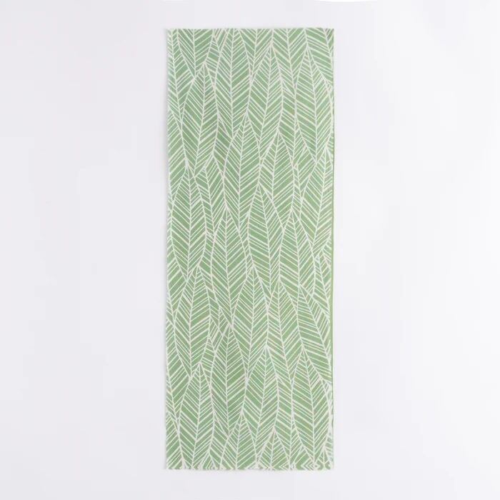 葉脈の連続模様をナチュラルな色合いで染めました。シンプルで使い勝手がよく、首元に巻けば大人の装いを楽しむことができ、キッチンや食卓でも使いやすい一枚。お弁当を包んだり敷き物にしたりと、アウトドアシーンでも活躍します。
